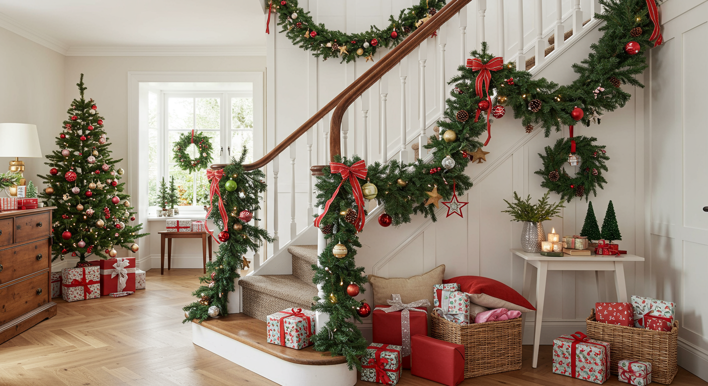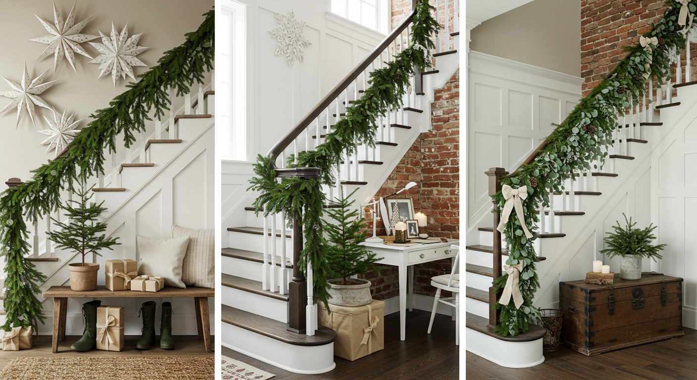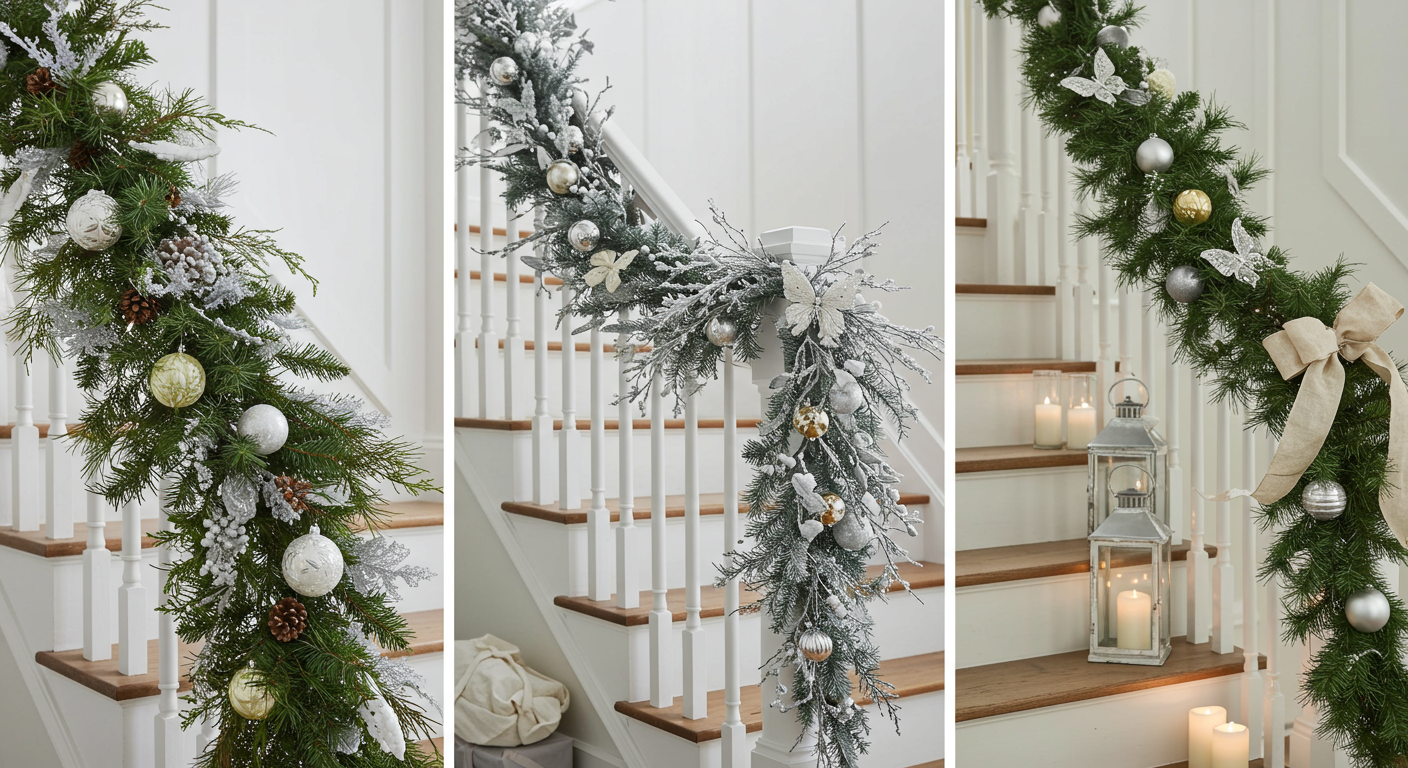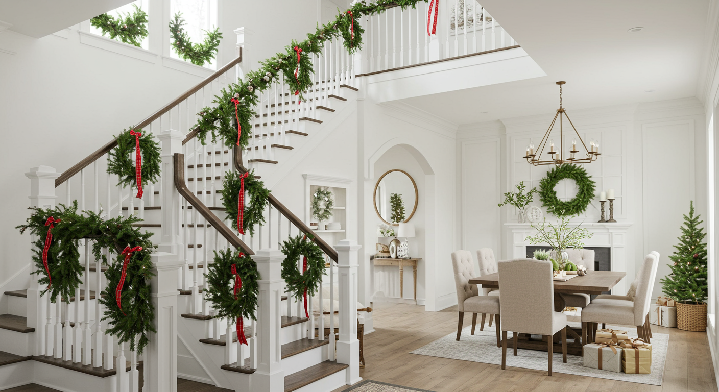 For a quick and easy design, grab some green garland and drape it along the railing. Top it off with a few bows, pine cones or wintery wall hangings to create a serene and elegant ambiance.