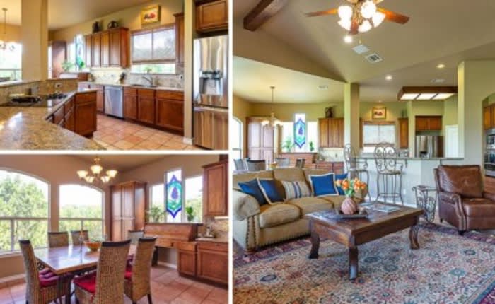The rest of the 3,141 square foot home includes four bedrooms, three and a half bathrooms, a game room with outdoor access and a three car garage with an extra parking spot for guests. Outside, the flat fenced yard backs to a greenbelt and offers plenty of space for everyone. Enjoy panoramic views from the upstairs deck and covered patio off the game room.