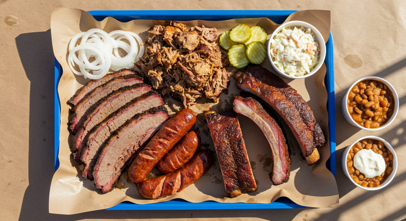 For those still on the search for the main course, Franklin Barbecue serves up half moist and half lean sliced brisket, sliced pork spare ribs, and sausage that contains pork and beef that can be purchased by the pound or by the link. Available sides include potato salad, slaw and pinto beans.