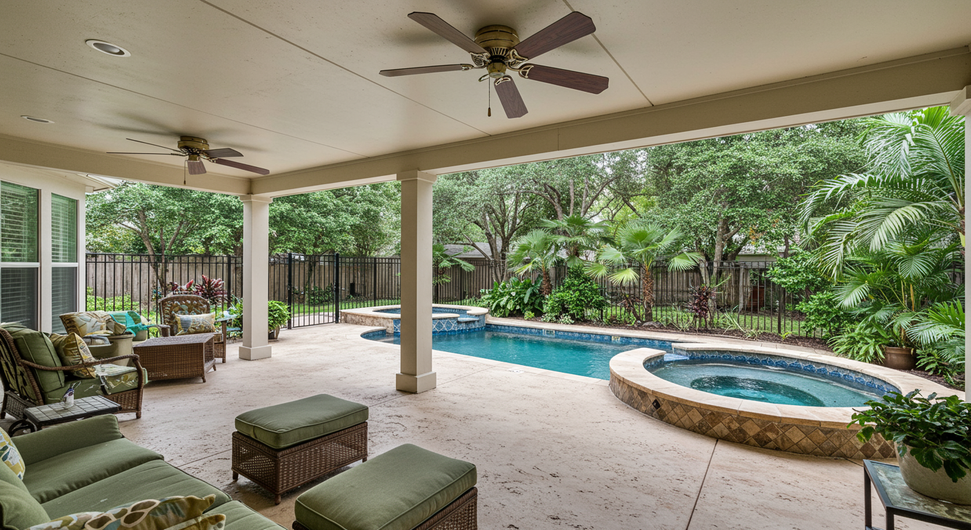 A single door from the family room opens onto the covered patio with multiple sitting areas and ceiling fans. The private backyard features a wrought iron fence, an abundance of foliage for shade, a gorgeous pool and spa, lounging and tanning areas, and plenty of room for children and pets to run and play.