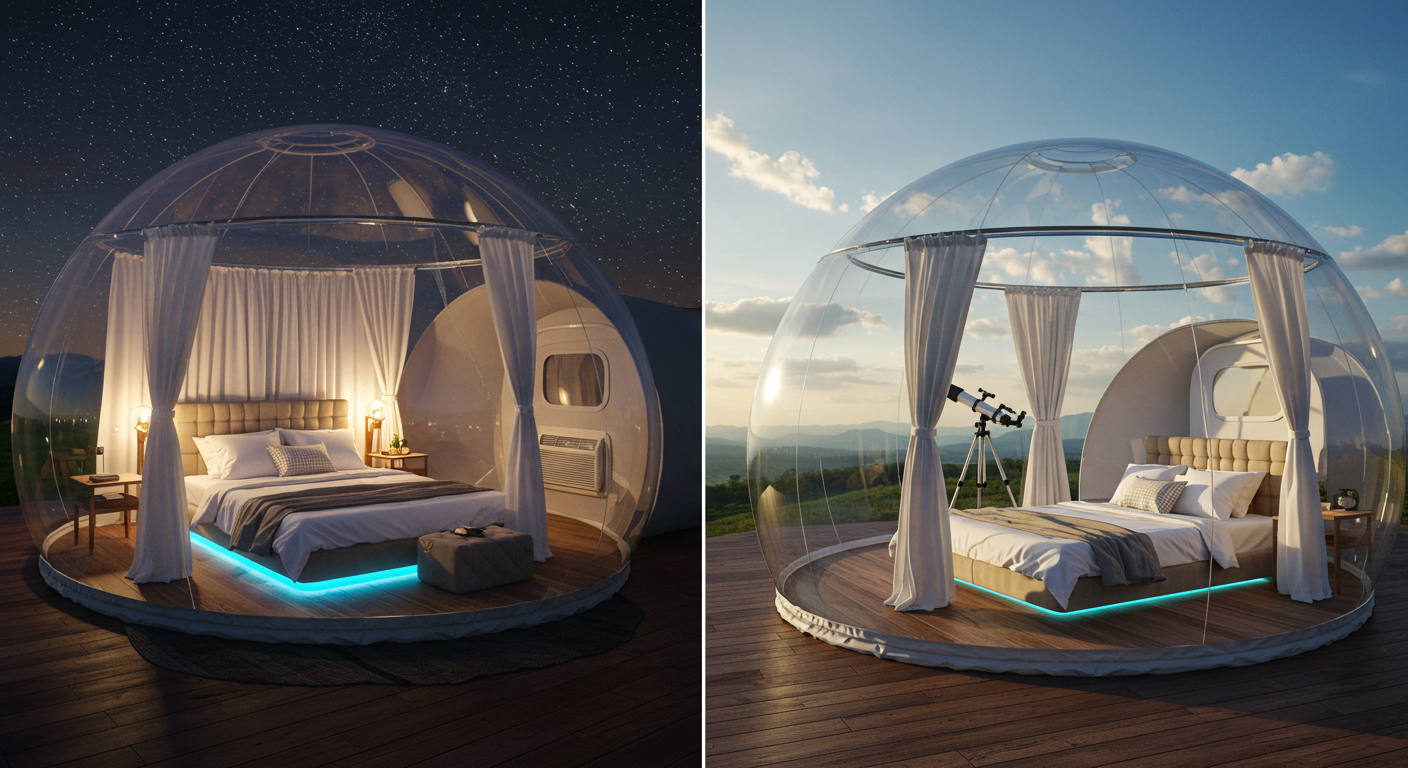 Offering an incredible glamping bubble tent, Hozhonion on the Hill is located approximately 1 hour outside of Austin on Lake LBJ. Perched 101 feet over Horseshoe Bay, the Stardome Suite features a private deck, amazing views of the night sky, and a clear dome to sleep beneath the stars. It also boasts a private bath, indoor/outdoor shower and an outdoor soaking tub.